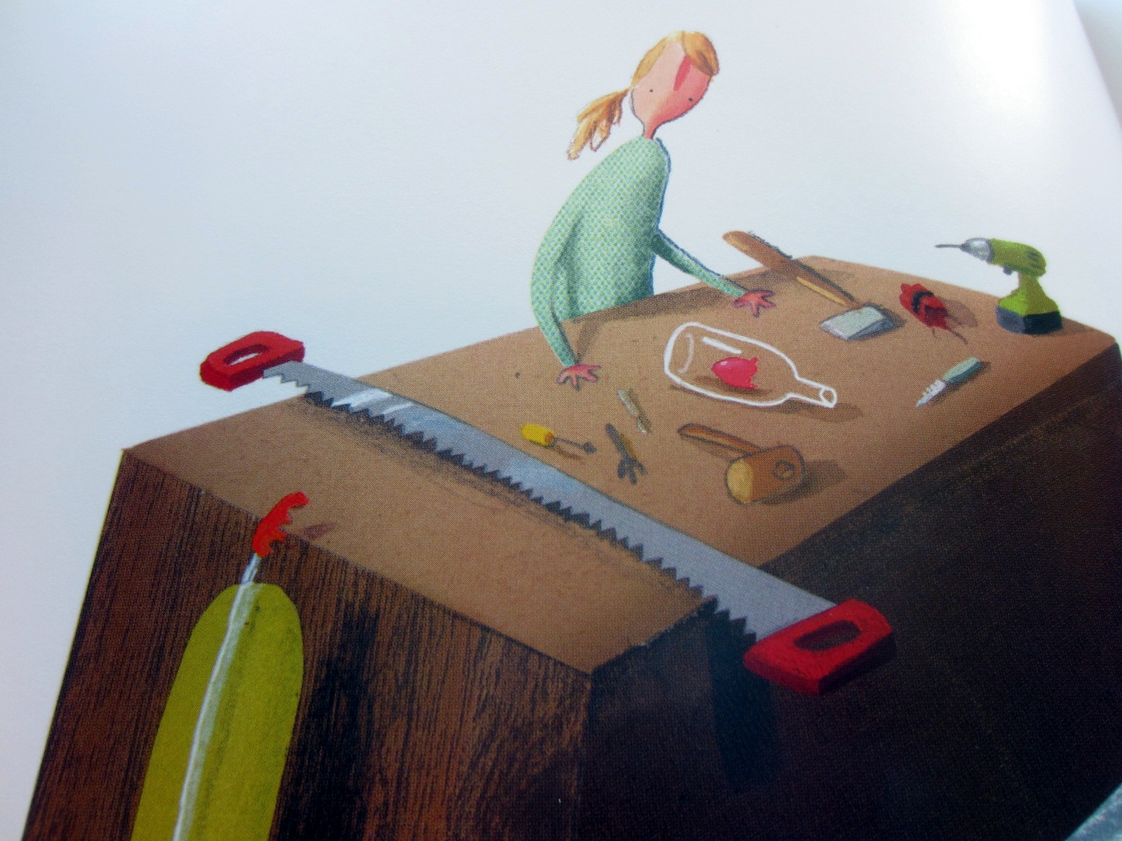 »Leider wurde die Flasche mit der Zeit immer schwerer. Also beschloss das Mädchen, sein Herz zu befreien. Nur konnte es sich nicht mehr erinnern, wie…« Kein Schütteln, kein Rütteln, kein Klopfen hilft, das Herz bleibt in der Flasche stecken. Bis sie jemanden trifft, der weiß, wie er es befreien kann, um all die schönen Dinge endlich wieder zu entdecken…