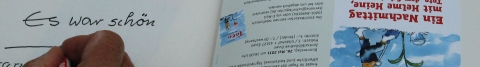 Ruhig und unermüdlich lässt er es sich auch im Anschluss der Veranstaltung nicht nehmen, Bilderbücher zu signieren, Widmungen zu schreiben und auch ein paar kleine Zeichnungen aufs Papier zu bringen.