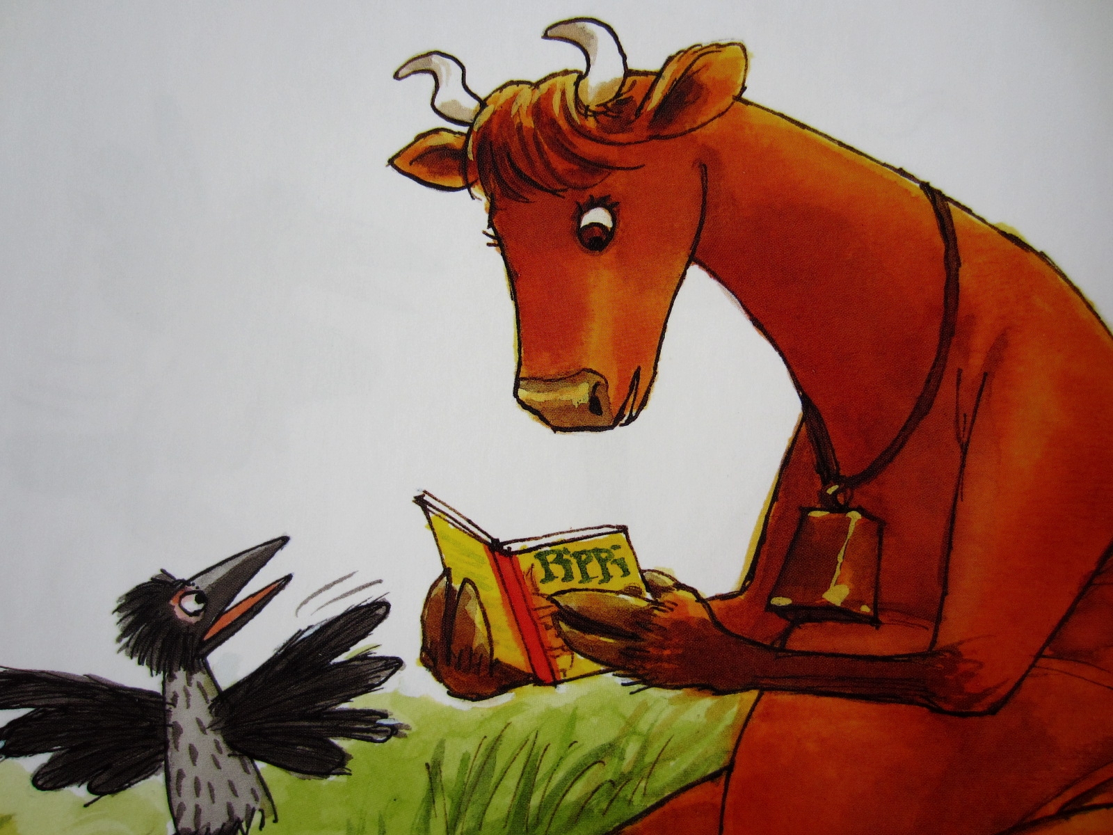 Die Krähe sank zusammen und setzte sich hin. »Kannst du nicht ganz normale Sachen machen?«, jammerte sie. »Fahrrad fahren und auf Bäume klettern und so was.« »Bücher sind so gemuhtlich, Krähe. Wenn man lesen kann, weiß man fast alles!«