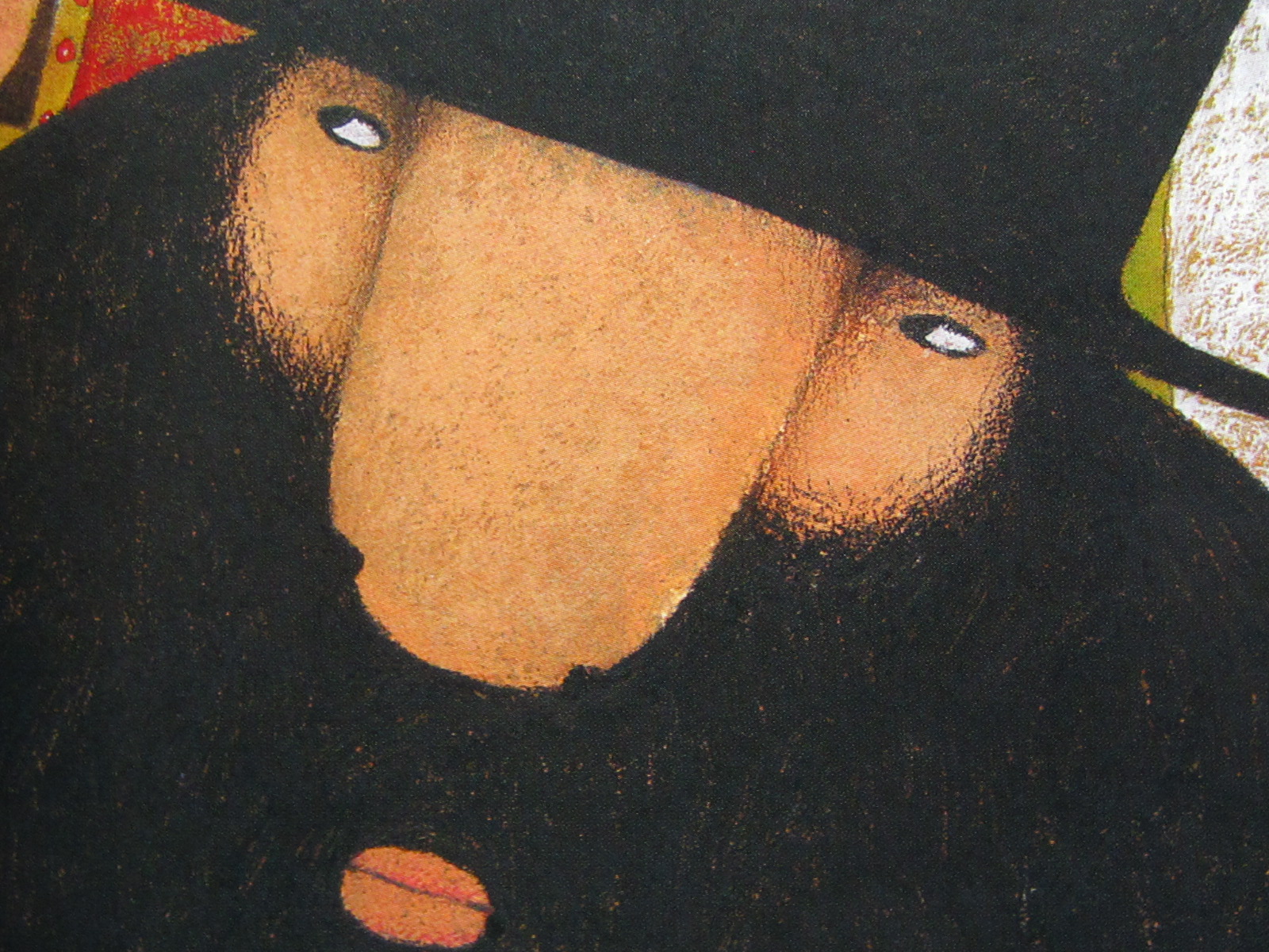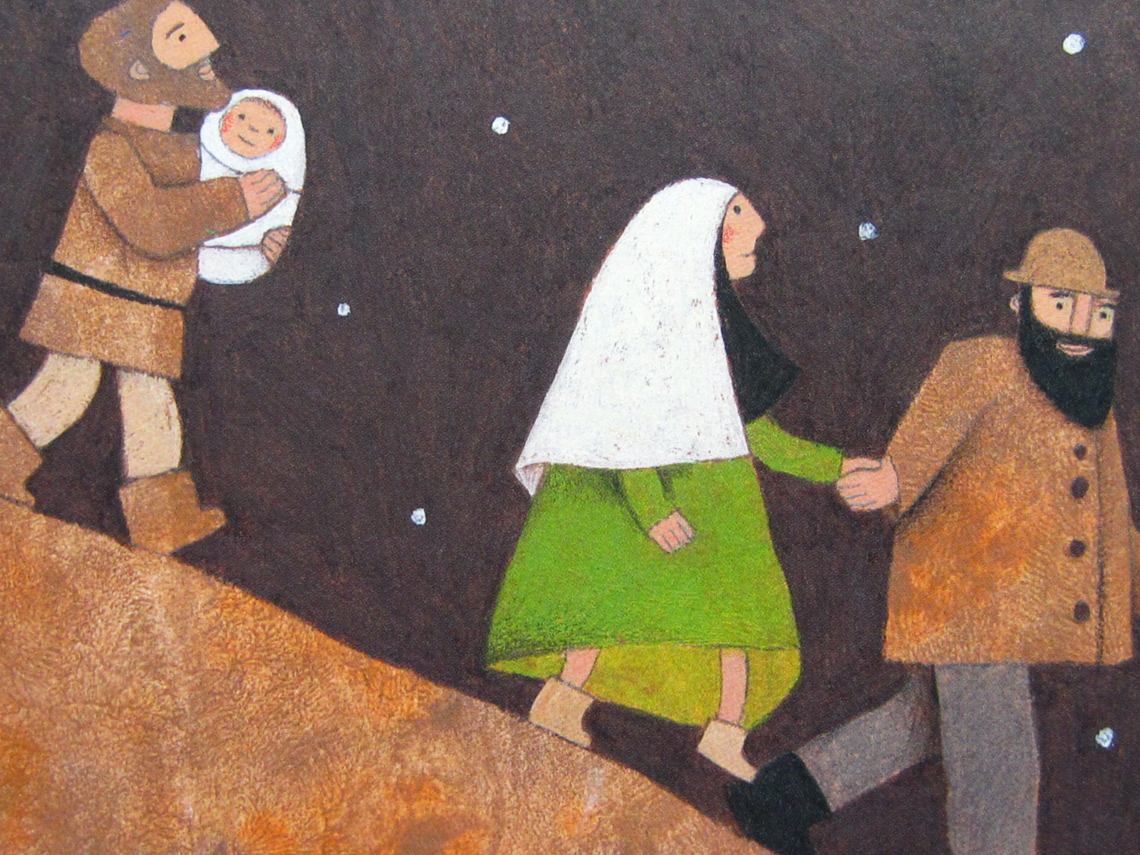 Der kleine Hirte hat schwer an seinen Gaben zu tragen und schon bald ist er der Letzte des langen Zuges. Der Räuber lässt ihn nicht aus den Augen, in der Hoffnung, ihn seiner Geschenke zu berauben. Doch dann muss er mitansehen, wie der Hirtenjunge erst die Decke an einen frierenden Mann verschenkt, dann den Krug mit der Milch an ein durstiges Mädchen. Jetzt reicht es dem Räuber und er schleicht sich an den Jungen heran. Allerdings verrät ihn sein knurrender Magen und bevor er sich versieht, hat ihm der Junge den Schinken und das Brot geschenkt. Den Rest des Weges zum Stall gehen die beiden gemeinsam und als der Räuber den Neugeborenen sieht, schämt er sich zutiefst, weil er ihm Brot und Schinken weggegessen hat…