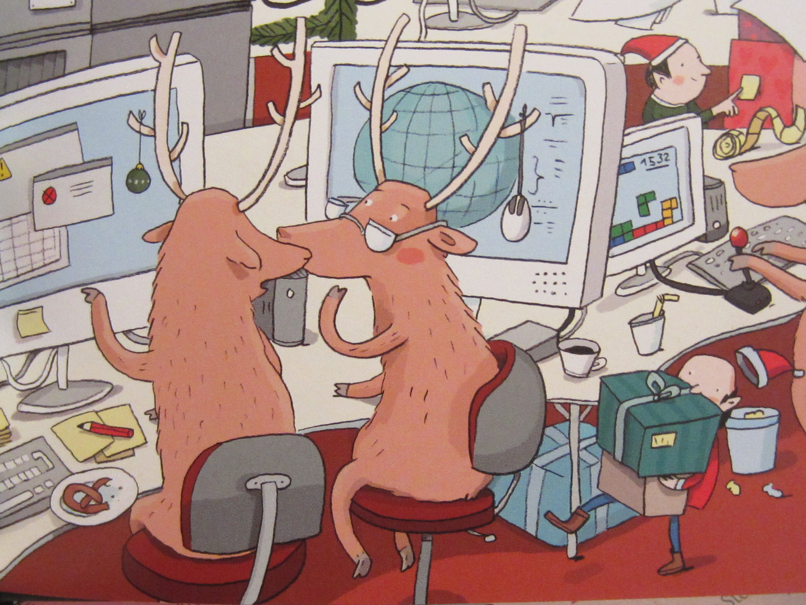 Statt nach Hause zu gehen, wo ein Adventskalender und der Klorollen-Weihnachtsmann auf ihn warten, stiefelt er zwei Stockwerke höher, zur weihnachtsfreien Zone, zur Weh-Geh. Aber was muss er dort mitansehen? Gerd, Stine und Tobi (die Weh-Gehler) backen… Weihnachtsplätzchen! Jetzt ist Kilian so richtig stinkig und schreit seinen ganzen Ärger heraus. Die Weh-Gehler sind aber intelligente Leute und können Kilians Zweifel aus dem Weg räumen. Allen Kindern auf der Welt zur rechten Zeit das richtige Geschenk zu bringen, ist dank ausgeklügelter Logistik überhaupt kein Problem für den Weihnachtmann. Kilian darf ihm sogar eine E-Mail schicken. Als der Weihnachtsmann ihm prompt antwortet, freut sich Kilian so richtig aufs Plätzchen backen mit seinen klugen, großen Freunden…