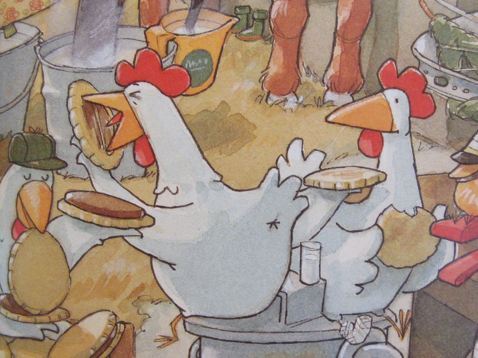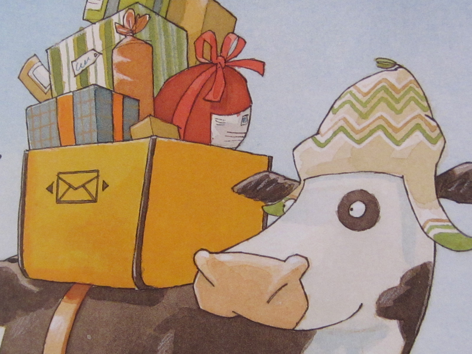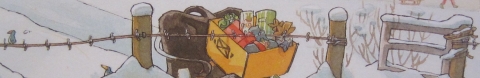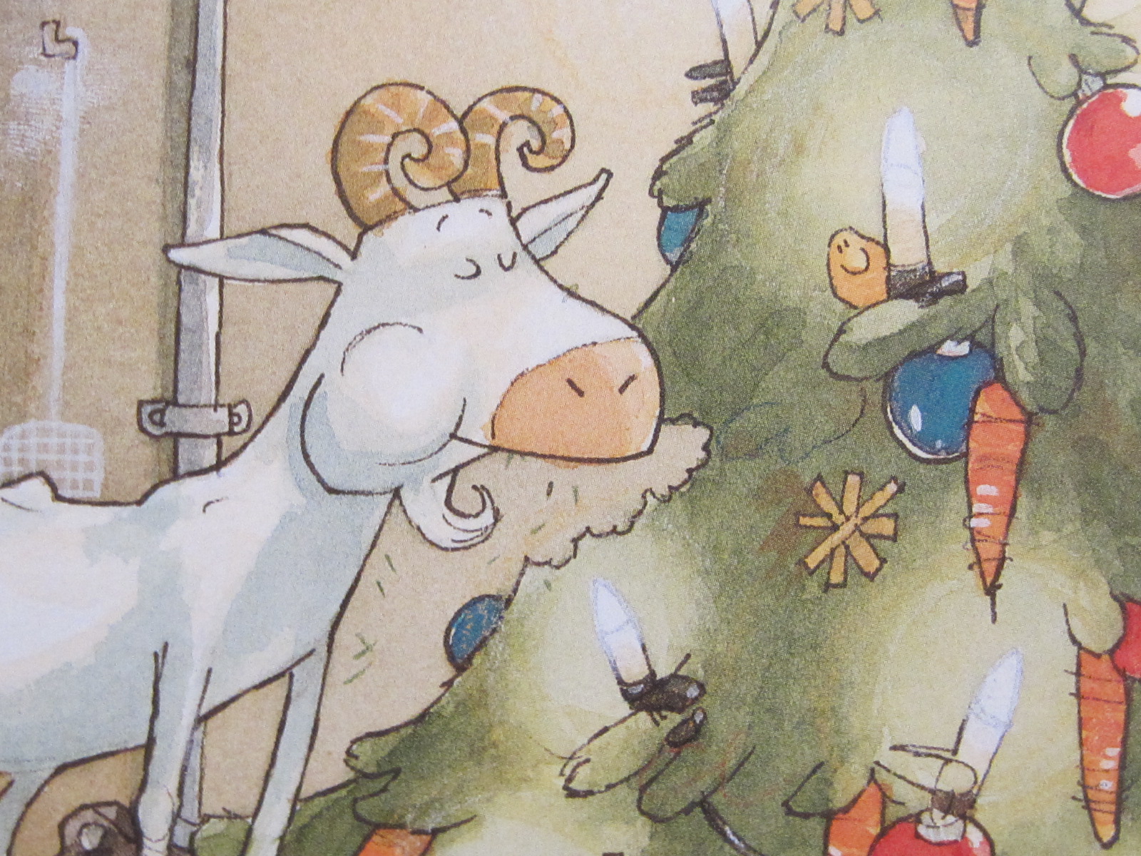 Dabei hat sich der Postbote doch so viel Mühe gemacht und mit viel Liebe Geschenke ausgesucht oder sogar selbst geschweißt, gestrickt, genäht, geflochten und gebacken. Eigentlich hätte er wissen müssen, dass es kein gutes Ende nimmt, wenn er Lieselotte beauftragt, all die Geschenke zu transportieren. Aber immerhin gibt sie sich Mühe. Doch bei all dem Schnee verfehlt sie mal den Weg oder läuft im Kreis und nachdem sie sich schon verlaufen hat, begegnet sie auch noch einem gierigen Monster, dass ihr die Zunge rausstreckt. Letztendlich findet sie – leicht panisch – tatsächlich den Weg zurück, auch wenn die Geschenke nicht mehr so ganz heil sind. Und der Postbote, der Heiligabend vorbei schaut, wundert sich, dass seine Geschenke teilweise eine ganz andere Verwendung gefunden haben…