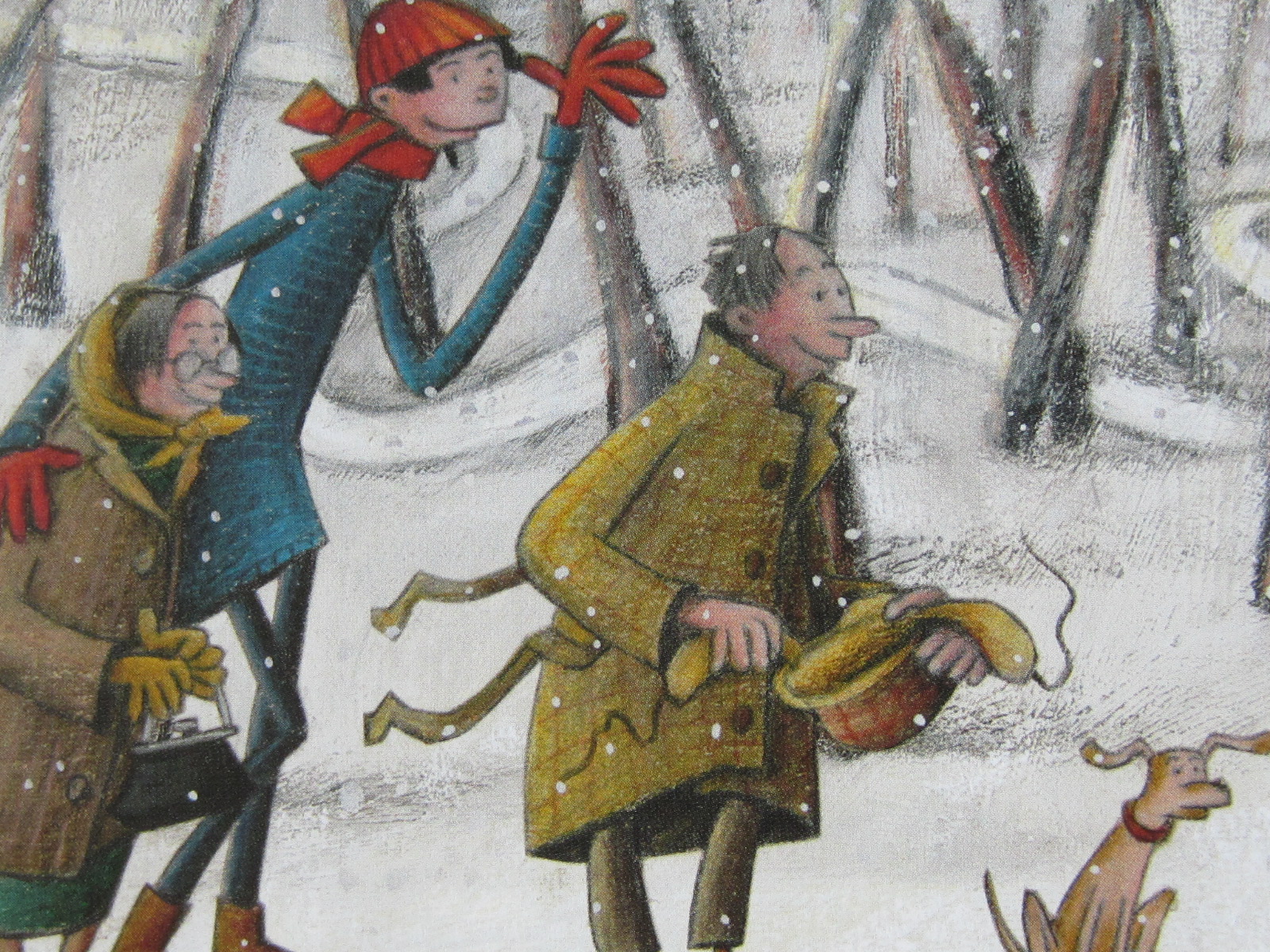 Draußen stürmt es und es dauert nicht lange, bis die Mütze weggeweht wird. Sie landet vor den Füßen eines jungen Mannes, der auch sehr einsam ist. Eine weitere Windböe lässt die Mütze weiter zu einer alten Frau fliegen, die sich über das unerwartete Geschenk freut, weil sie selbst kein Geld für eine Mütze hat. Doch die Reise der Mütze ist noch nicht beendet, ihr nächster Halt ist vor einem struppigen, abgemagerten Hund. Mit dem nächsten Windstoß geht die Reise der Mütze weiter… Und diesmal landet sie ganz sanft auf dem Kopf eines kleinen Jungen. Dieser erzählt voll Freude von dem behaglichen Weihnachtsfest, das ihm bevorsteht und lädt die drei samt Hund kurzerhand am Heiligabend zu sich nach Hause ein…