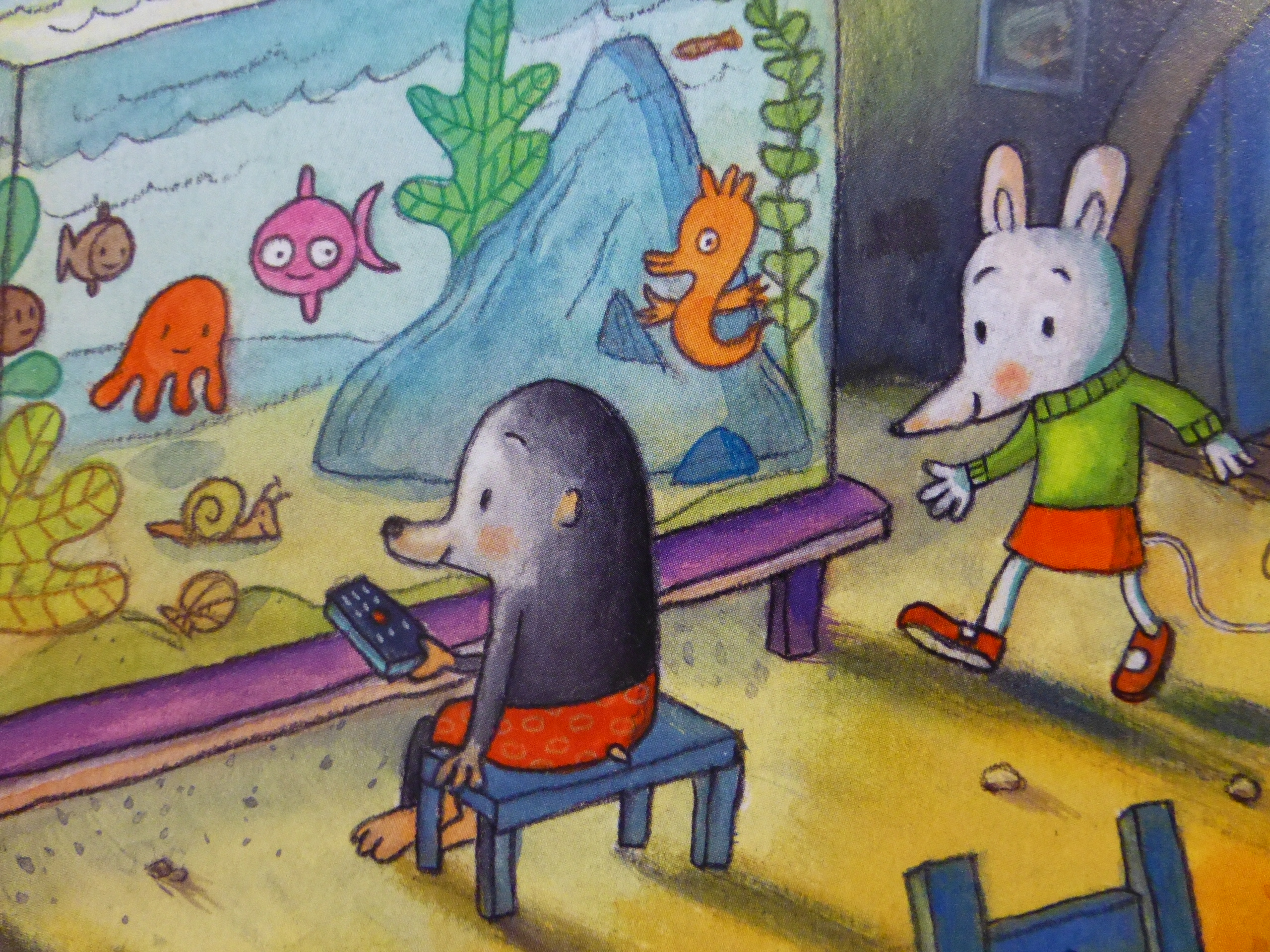 Dass sie eigentlich vor einem Aquarium sitzen, haben sie dabei ganz schnell vergessen. Aber eines Tages kommt der Molch vorbei und stellt Malte einen richtigen Fernseher hin. Toll, denkt Malte, den kann er doch auch ganz prima gebrauchen. Nur vielleicht nicht so, wie es sich der Molch gedacht hatte…